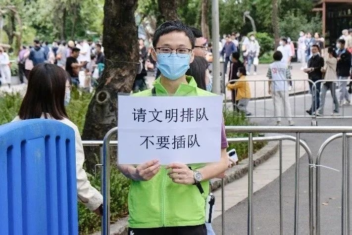 大熊猫馆外,志愿者引导客流有序排队