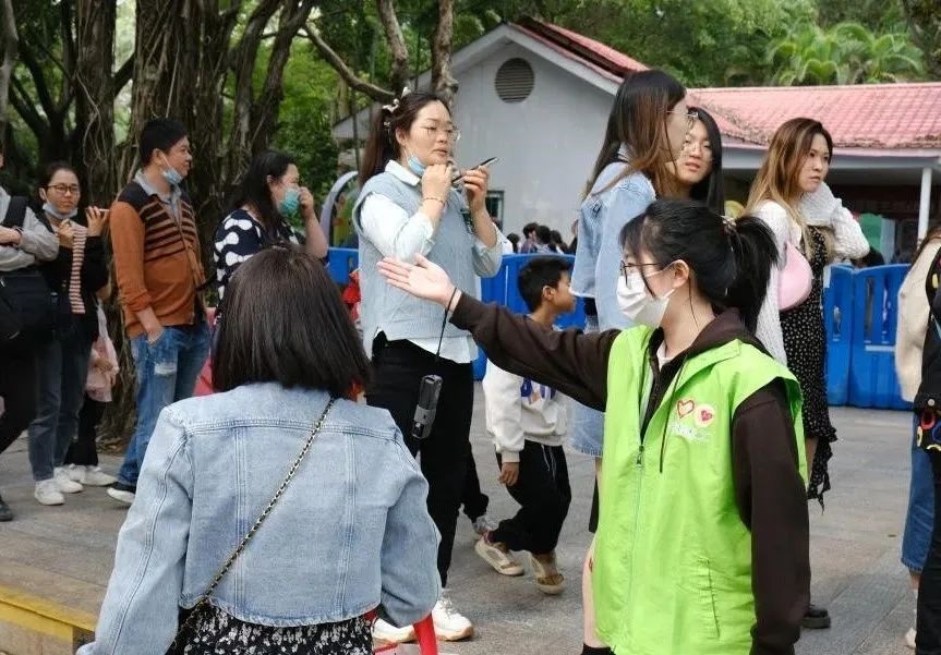 园区内动物场馆众多,游客摩肩接踵,工作环境较为复杂且艰苦。在引导客流的同时,同志们通过手持地图为游客提供分区指引和游览建议,并善意地劝阻插队、投喂动物等不文明行为。随着园内客流量持续增加,轮岗方式尚不能满足志愿服务需求。对此,轮休的同志自愿承担起物资派送、信息发布等工作,并时刻关注工作群发布的“缺人”信息,及时补位,确保志愿服务平稳、持续地进行。凭借紧密高效的沟通,同志们协助园内安保、饲养员等维持了游览秩序,并顺利地帮助多名游客找到走失的儿童。
