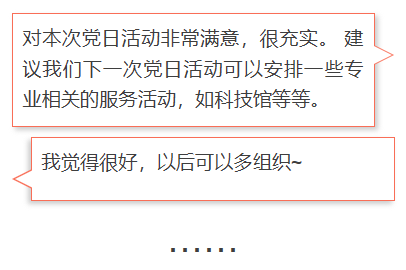 傍晚,同志们带着疲倦和满足结束了一天的志愿服务工作。为进一步优化支部工作安排,提升支部组织生活质量,支委会采用无记名问卷形式调查同志们的活动参与体验。同志们高度认可本次党日活动的组织和内容,并对后续党日活动的主题提出自己的建议。