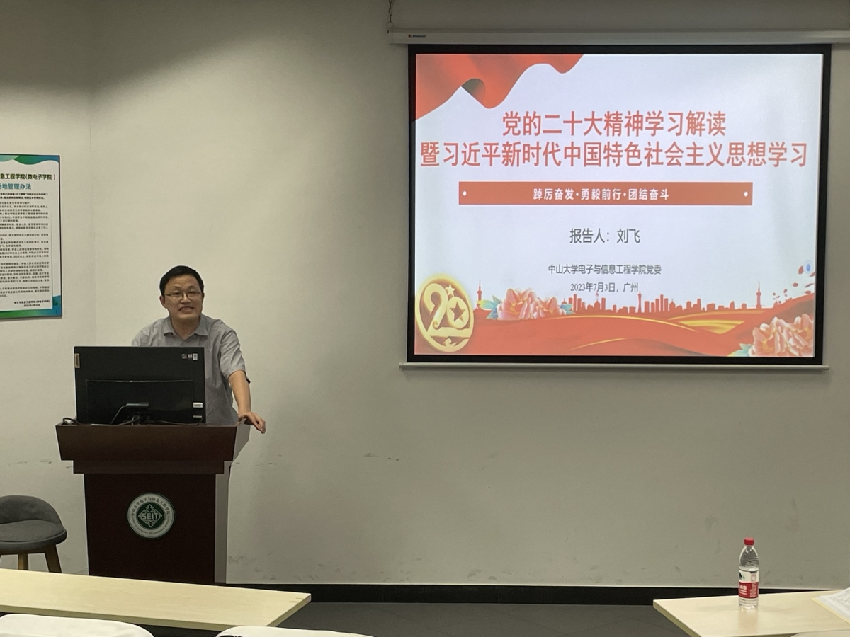 2023年7月3日,围绕深入学习贯彻习近平新时代中国特色社会主义思想,学习贯彻党的二十大精神和习近平总书记关于建设教育强国的重要论述, A片直播 党委书记刘飞以“党的二十大精神学习解读暨习近平新时代中国特色社会主义思想学习”为题,为学院电子科学与技术硕士第一党支部全体党员同志讲授专题党课,勉励大家提高政治站位、牢记职责使命、扎实学好本领,为社会主义事业发展贡献自己的一份力量。