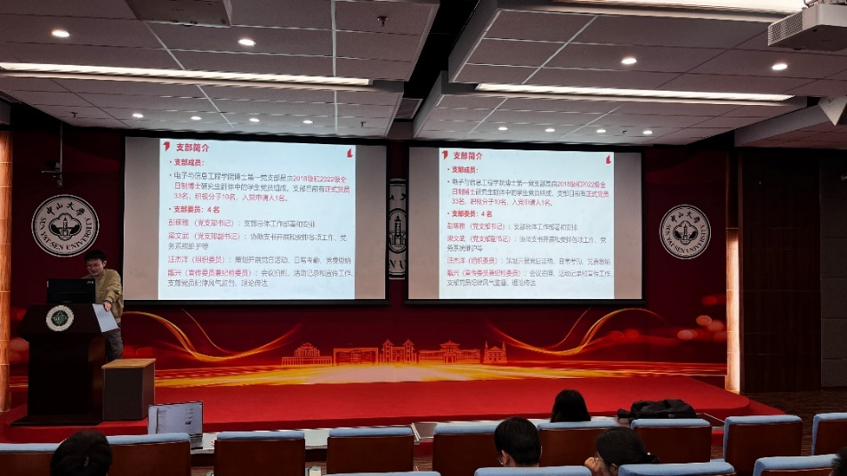 会上,彭琢雅同志首先代表支委会作2023年度支部书记述职和支部党建工作报告。在学院党委的指导关心下,支部党建工作有序开展、稳中求进,取得了丰硕的成果。一是创新组织生活形式。2023年,支部先后开展 “守初心践使命,廉修身铸忠诚”主题党日活动;联合清华大学开展“党建学术共融·创新交流启航”主题党日活动;联合电科硕士第二党支部开展“强党性,促科研”主题党日活动,有效提升支部党员责任感和支部凝聚力。二是加强党员思政教育工作。支部组织开展“学习贯彻习近平新时代中国特色社会主义思想主题教育”专题学习会,并邀请佘峻聪院长、李敏智副书记上专题党课,带领党员同志们深入领会习近平新时代中国特色社会主义思想的重要精神,努力在以学铸魂、以学增智、以学正风、以学促干方面取得实实在在的成效。三是践行服务群众宗旨。支部联合广州市海珠区金雅苑社区上门慰问了数位党龄在50年以上的老党员,积极走出校园,服务社会。四是发挥示范引领作用。支部于2023年3月入选第四批全省党建工作样板支部,正在努力建设成为一支团结向上、充满凝聚力、战斗力的先进工科博士研究生党员队伍。根据彭琢雅同志汇报的支部开展2023年各项工作情况,支部党员对支部委员会建设情况进行了民主测评,一致评定党支部委员会建设情况为“好”。