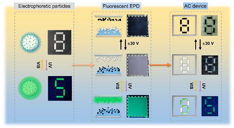 防伪技术在防止假冒产品和保护机密信息方面至关重要,广泛应用于产品标签、护照、机密文件等领域。光学防伪设备具有显示性能好、使用便捷和响应速度快等优点,但单一功能的防伪技术存在容易被复制且安全性不够的问题。因此,需开发具备动态显示功能的防伪设备。电泳显示器件(EPD)因其低功耗、动态图像切换和高环境对比度等优势,成为动态防伪技术的理想选择。然而,目前商用EPD设备大多仅在可见光条件下工作,显示性能依赖于光源强度,限制了其在黑暗环境和非可见光条件下的应用。荧光电泳显示技术则能使EPD在紫外光下正常工作,拓展了传统EPD在紫外光场景中的应用可能。同时,通过结合反射和发射的双显示模式,可以实现多模式的动态防伪应用。