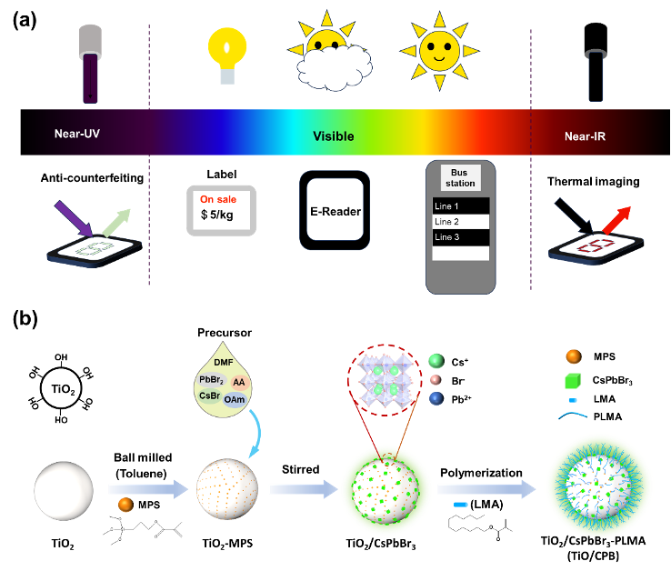 杨柏儒教授团队开发出了一种新型荧光电泳显示(EPD)技术。该团队通过在传统的电泳粒子TiO₂上复合钙钛矿量子点(CsPbBr₃),制备了具备荧光特性的电泳粒子,并进一步研制了一种多功能防伪器件。该器件不仅响应快速、对比度高,而且能够呈现明亮的绿色荧光,为未来的动态防伪和识别提供了新思路。这项研究成果以题为“Fluorescent, multifunctional anti-counterfeiting, fast response electrophoretic display based on TiO2/CsPbBr3 composite particles”发表在《Light: Science & Applications》期刊上,杨柏儒教授为通讯作者,博士生刘广友为第一作者。此项研究得到了国家重点研发计划、科技部项目、广东省重点地区研发计划等项目的支持。