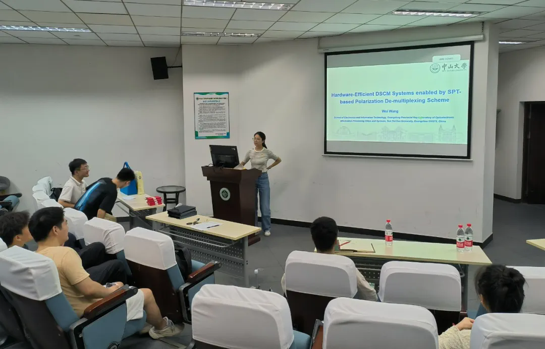 随后,王玮同志则以“Hardware-Efficient DSCM Systems enabled by SPT-based Polarization De-multiplexing Scheme”为题,汇报了光MIMO课题的研究内容。她的报告内容丰富,由浅入深,清晰地阐述了光MIMO技术的背景、现状及未来发展趋势。
