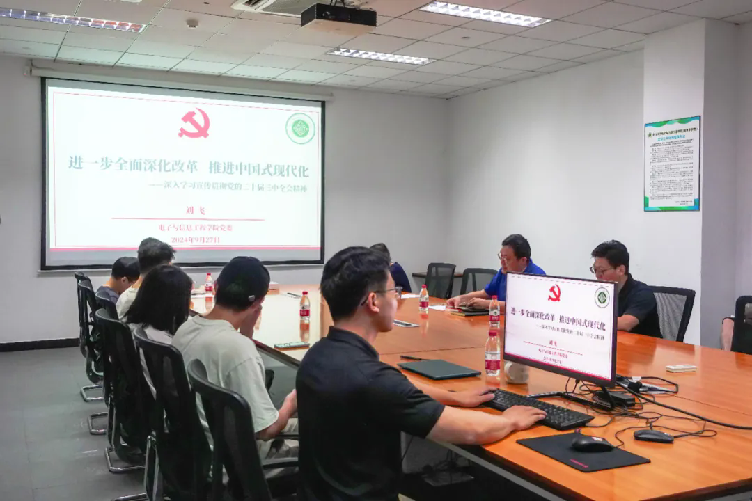 首先,刘飞书记带领各支部书记集中学习党的二十届三中全会精神。这次全会是在以中国式现代化全面推进强国建设、民族复兴伟业的关键时期举行的一次十分重要的会议。全会审议通过的《中共中央关于进一步全面深化改革 推进中国式现代化的决定》深刻阐述了进一步全面深化改革、推进中国式现代化的重大意义和总体要求,是指导新征程上进一步全面深化改革的纲领性文件。学习好贯彻好党的二十届三中全会精神,是当前和今后一个时期全党全国的一项重大政治任务。刘飞书记强调,学院要上下联动、共同推进,按照学校党委统一部署及工作要求,将贯彻落实党的二十届三中全会精神与教育教学、管理服务等深度融合。希望各支部联系专业实际,通过“三会一课”等形式深入开展党的二十届三中全会精神的学习。