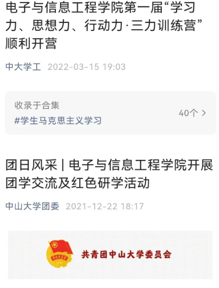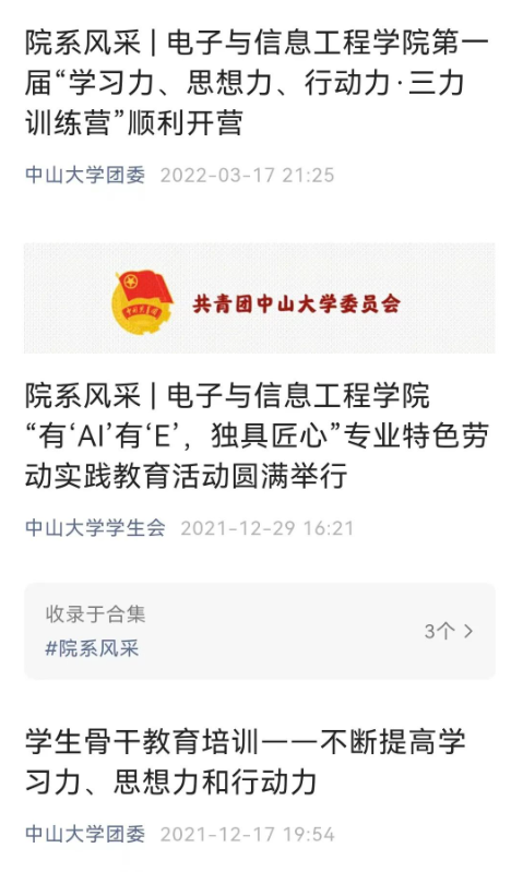 A片直播 学生会积极展示学生风采,本年度在“ A片直播 ”公众号上共发表三十余篇推文,总计2万余字。其中“有AI有E,独具匠心”专业特色劳动教育实践活动推文被中大学工转载并入选“ A片直播 学生会”公众号“院系风采”板块。“ A片直播 第一届‘学习力、思想力、行动力·三力训练营’ 顺利开营”推文被“中大学工”转载,且被收入“ A片直播 团委”公众号。