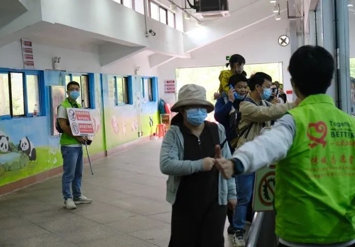 大熊猫馆内,志愿者引导游客文明游览