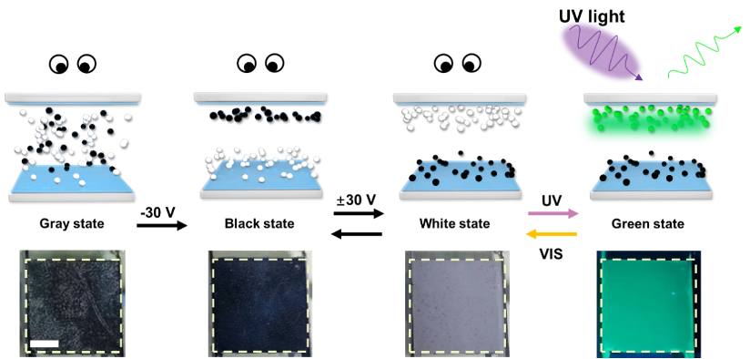 图3.荧光EPD在白、绿、黑三种状态下的原理图和照片。比例尺:1厘米