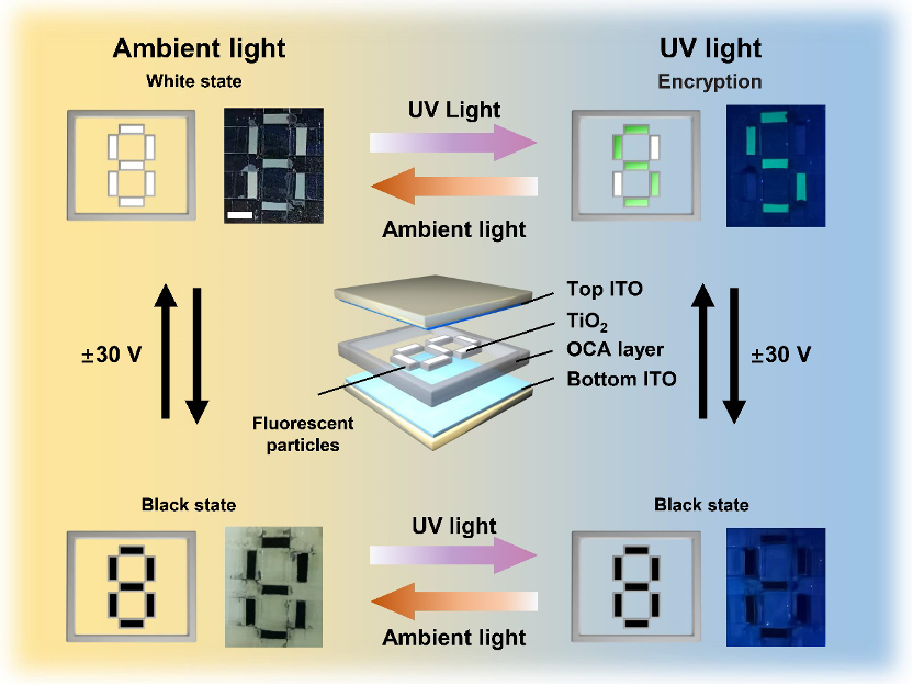 研究团队基于荧光电泳显示器制备了防伪显示器件,该防伪器件采用多层结构设计,由顶部和底部ITO层以及带有图案化的OCA层组成。通过在数字“8”图案中的数字“5”区域填充荧光电泳分散液,而在其他区域填充普通电泳分散液,在可见光下,该EPD能够在30V电压下实现黑白数字“8”的切换。当白色粒子被驱动到ITO顶层时,可以通过切换紫外光,实现数字“5”图案的绿色状态和数字“8”图案的白色状态。荧光EPD技术拓展了EPD在动态防伪与多功能显示上的应用,有效提升了防伪安全性。该动态防伪器件在电场和紫外光照下可以实现其双模式显示,未来可以应用于智能防伪器件中。该器件具备快速响应、通过控制电场和紫外光实现防伪设备的隐私可控、智能化、多功能动态显示等特点,具有相对较高的保密性。未来,该技术有望应用于更多显示器件领域,通过集成商业化的驱动电路,如无源矩阵(PM)或有源矩阵(AM),进一步提升其应用广度和安全性。