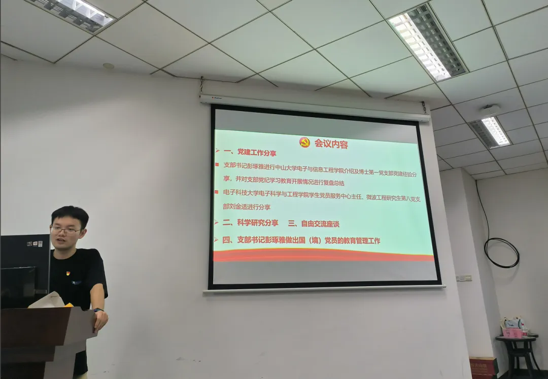 2024年9月21日晚, A片直播 博士第一党支部与电子科技大学电子科学与工程学院微波工程研究生第八党支部在东校园信息大楼101会议室联合举办“党建学术共融·创新交流启航”主题党日活动。本次活动采用汇报分享的形式,旨在深化党建交流,促进支部建设,增强党员之间的联系与合作,并结合博士第一党支部的特色主题党日活动“学术沙龙”,以期拓展支部党员的学术视野,提升整体学术水平。活动由博士第一党支部书记彭琢雅同志主持。