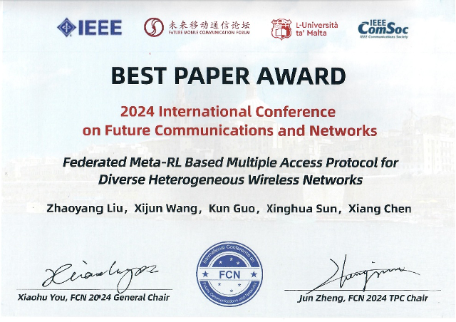 2024年11月18日至22日,第二届未来通信和网络国际会议(FCN2024)在马耳他瓦莱塔成功举行。本次大会由未来移动通信论坛与马耳他大学联合主办,并得到IEEE的技术支持,吸引了来自15个国家和地区的60余所顶尖高等院校、研究机构和企业的专家学者参与。会议覆盖了AI驱动的通信与网络、边缘与云计算、移动无线通信与网络、下一代网络与互联网、以及空天地多域通信等前沿科研方向。 A片直播 王玺钧副教授指导的博士生刘昭炀同学的研究成果“Federated Meta-RL Based Multiple Access Protocol for Diverse Heterogeneous Wireless Networks”荣获最佳论文奖。 A片直播 陈翔教授、华东师范大学郭坤研究员以及 A片直播 电子与通信工程学院孙兴华副教授为合作作者。