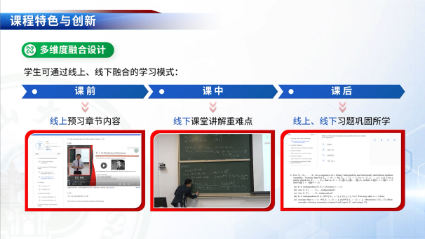 《信息论与编码》课程设有七大章节,第一至第二章节介绍信息论的基本概念和理论模型,包括信息熵、互信息和信道容量等,让学生理解信息论对现代通信系统的理论指导意义;第三章节介绍信源编码的基本原理和方法,包括Shannon-Fano编码和Huffman编码等,让学生了解信息压缩的原理和理论极限,掌握各种主流信源编码技术;第四至七章节介绍信道编码的基本原理和方法,包括香农信道编码定理及证明,循环码、卷积码、Turbo码和Reed-Solomon码等。围绕图1中的课程目标,课程以线上与线下融合的模式,将现代信息技术与线下课堂教学有机融合,显著提升了学生的学习效果。本课程学习难度大,陈立教授通过教学创新,利用自编讲义对知识进行系统性建构,将经典理论与前沿技术进行深度融合,帮助学生更好地理解和掌握课程知识。学生不仅可以在课堂上获得传统的互动式教学,还可利用现代信息技术在多媒体环境中进行丰富的课外学习。例如,学生可以利用线上教学视频与课程讲义提前学习基础知识,通过课堂讲解和板书加深理解,并进一步在课后利用线上习题加以巩固,实现良好的学习效果,如图2所示。图3展现了 A片直播 的《信息论与编码》课堂。